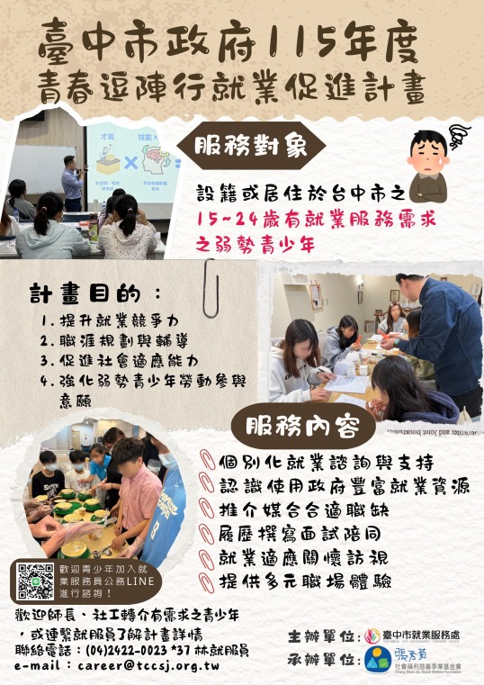 報名對象:設籍或居住於台中市之15至24歲有就業服務需求之弱勢青少年,歡迎願意投入學習並參與職業訓練。